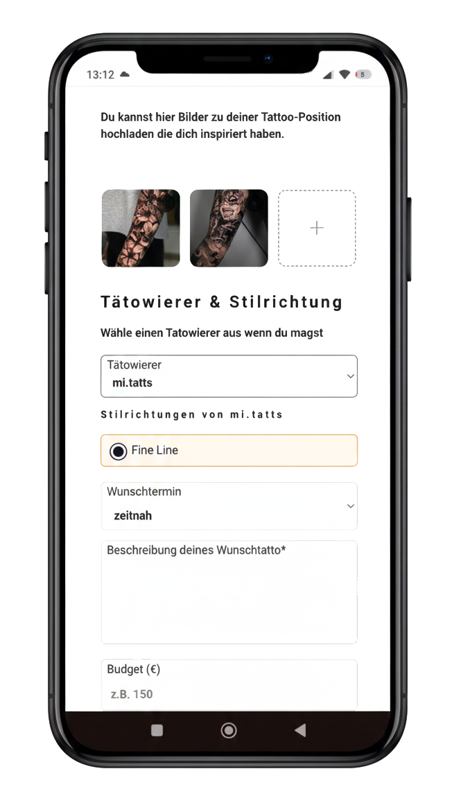 Exakte Platzierung, Referenzen, Artist-Auswahl – alles in einer Anfrage, egal ob Handy, Tablet oder Desktop.